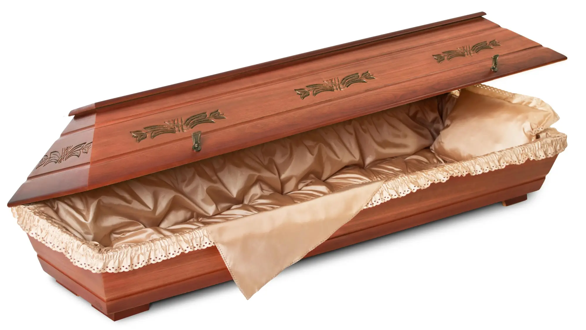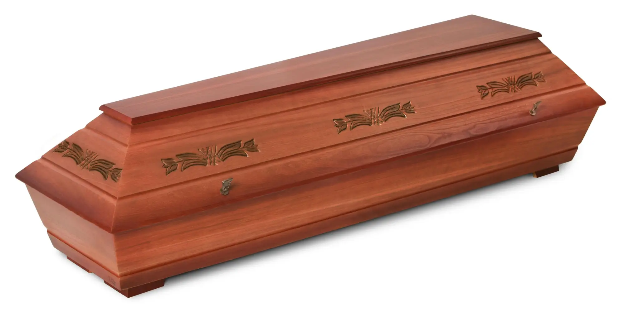 Dřevěná obřadová rakev s výrazným teplým odstínem višně s patinou, výraznou strukturou dřeva, zdobená jemným vypalováním s motivem tulipánů po obvodu víka.